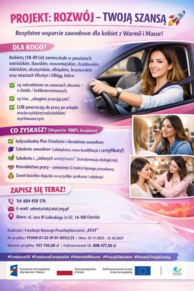Fundacja Rozwoju Przedsiębiorczości „ATUT” z Ostródy, rozpoczęła realizację projektu pt. „ROZWÓJ – TWOJĄ SZANSĄ” (nr FEWM.07.02-IP.01-0053/25), współfinansowanego ze środków Unii Europejskiej.