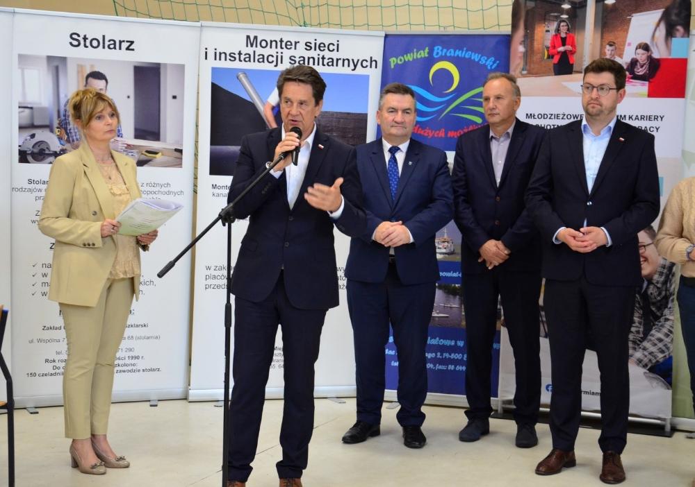 Podsekretarz Stanu w Ministerstwie Aktywów Państwowych Andrzej Śliwka , Starosta Braniewski Karol Motyka, Wicestarosta Mirosław Kudliński, Warmińsko-Mazurski Wojewódzki Komendant OHP w Olsztynie Dariusz Rudnik, Zastępca Wojewódzkiego Komendanta OHP w Olsztynie Paweł Kowszyński, Dyrektor Centrum Edukacji i Pracy Młodzieży OHP w Elblągu Iwona Klim, Dyrektor Zespołu Szkół Zawodowych im. Jana Liszewskiego w Braniewie Joanna Sokół oraz Przewodniczący Powiatowej Rady Rynku Pracy Marian Nadziejko. Braniewskie Targi Pracy i Przedsiębiorczości uroczyście otworzyła i prowadziła Dyrektor Powiatowego Urzędu Pracy w Braniewie Agnieszka Zdanowicz.